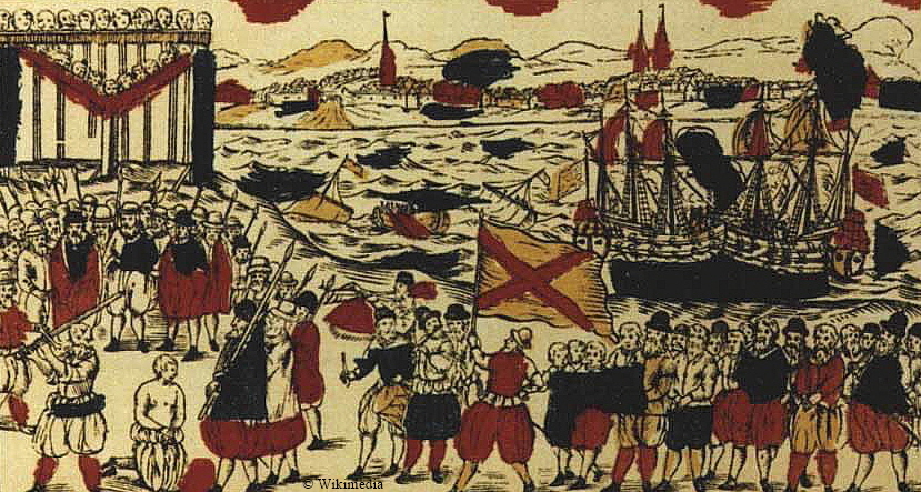 ↑ Hinrichtung von Vitalienbrüdern im Jahre 1401. Darstellung auf einem damals üblichen Handzettel mit Begleittext: Anno 1401. haben die Hamburger den berühmten See-Räuber Claus Störtebeck / nebst noch einem / Wichmann genannt / bey das Heilig-Land angetroffen / worauff sie die See-Räuber tapfer angegriffen / bey 42. Mann erschlagen / und 70. gefänglich in Hamburg gebracht / welche alle auf dem Brocke sind enthauptet / und ihre Köpffe auf Pfähle gestecket; der Scharfrichter so sie gerichtet / hieß Rosenfeld. Zum Gedächtniß dieser / oder der Hamburger rühmlichen That (welche Ehre / nebst GOtt / dem Herrn Simon von Utrecht / Herrn Hinrich Jenefeld / und Herrn Claus Schacke / Raht-Männer zu Hamburg / und Haupt-Leute auf den Schiffen zuzuschreiben ist) hat man eine stattliche Silber-Geschirr so in der Schiffer Gesellschafft befindlich machen lassen / aus welchen Fremde und Einheimische die Gesundheit zu trinken pflegen / und wird dabey ein Buch überreichet / in welchen jedweder seinen Nahmen / nebst einem Gedenck-Spruch einzuschreiben pflegt / und solch Geschirr wird der Stürtzebecher genannt. Im selbigen Jahr sind abermahl 80. See-Räuber aufgebracht / deren Hauptleute waren Gödecke Micheel und Gottfried Wichold / promovirter Magister Artium, sie wurden gleichfals auf dem Brocke enthauptet / und ihre Köpffe auf Pfähle / zu den vorigen gestecket.